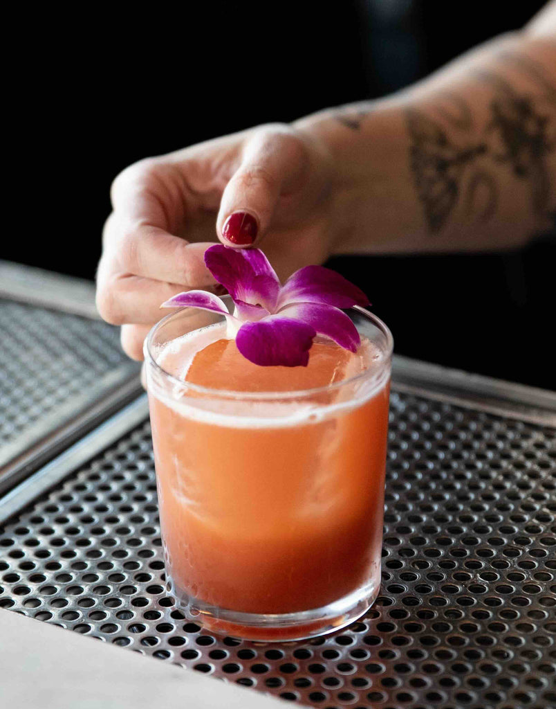 Shake all the ingredients with ice, then strain into a double old-fashioned glass over 1 large ice cube. Garnish with an orchid or orange half-wheel.