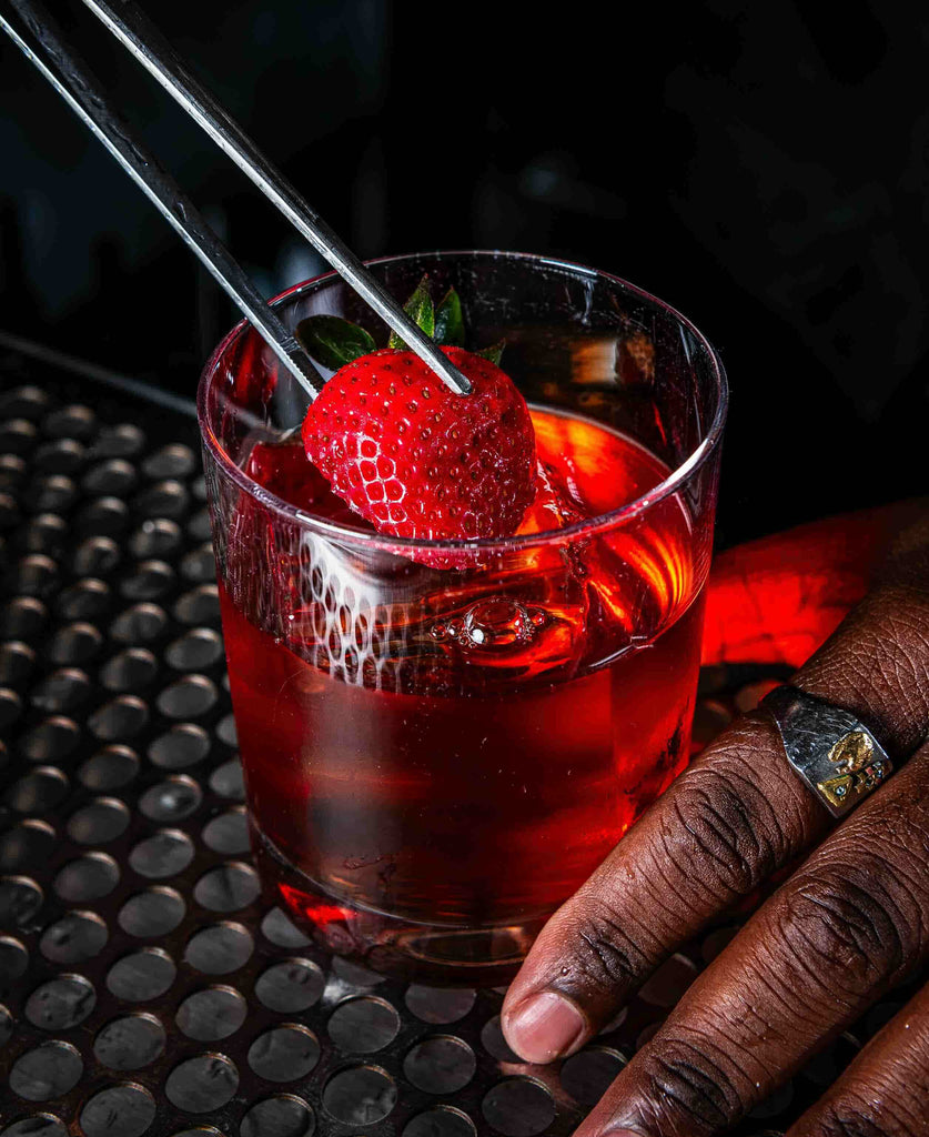 This drink began as a study in suggestion—how to evoke a flavor without using it outright. Here, the idea of strawberry comes not from fruit or syrup, but from the bright, floral depth of Cocchi Rosa Vermouth, which layers beautifully with bourbon’s warmth, Campari’s bite, and the rich, earthen sweetness of clairin and cacao. The result recalls chocolate-dipped strawberries and soft banana, all filtered through the bittersweet lens of a classic Boulevardier. The garnish—a simple half strawberry—ties perception to reality, completing the illusion.