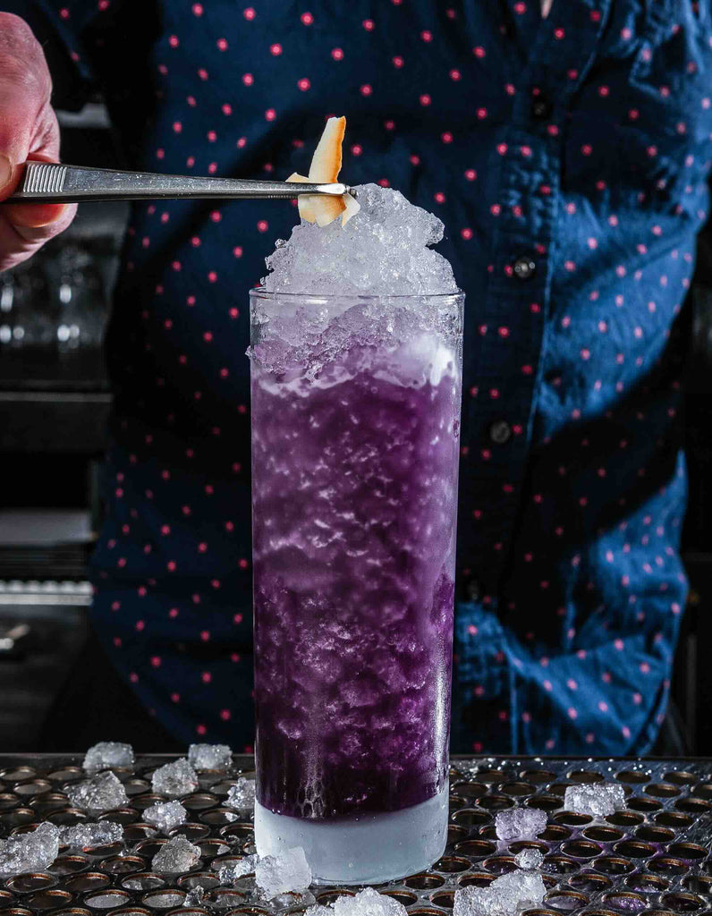"A lush, tropical punch with a spellbinding twist, Velvet Hex layers bright Caravedo Acholado pisco and rich Romate cream sherry with sweet coconut, pineapple, and lime, then wraps it all in the soft, vanilla-nutty flavor of ube. Inspired by my Filipino partner and our shared love of ube desserts, this tall, crushed-ice drink is silky, vibrant, and just a little dangerous—like a velvet spell in a glass. Ube, the purple yam beloved in Filipino cuisine, is the star here. Instead of powder, I use Butterfly ube extract, which delivers pure flavor and seamless integration without the chalky texture. Together with pisco’s citrus-spice brightness, sherry’s dried-fruit richness, and coconut liqueur’s lush depth, it transforms the punch into something both comforting and otherworldly." —MM