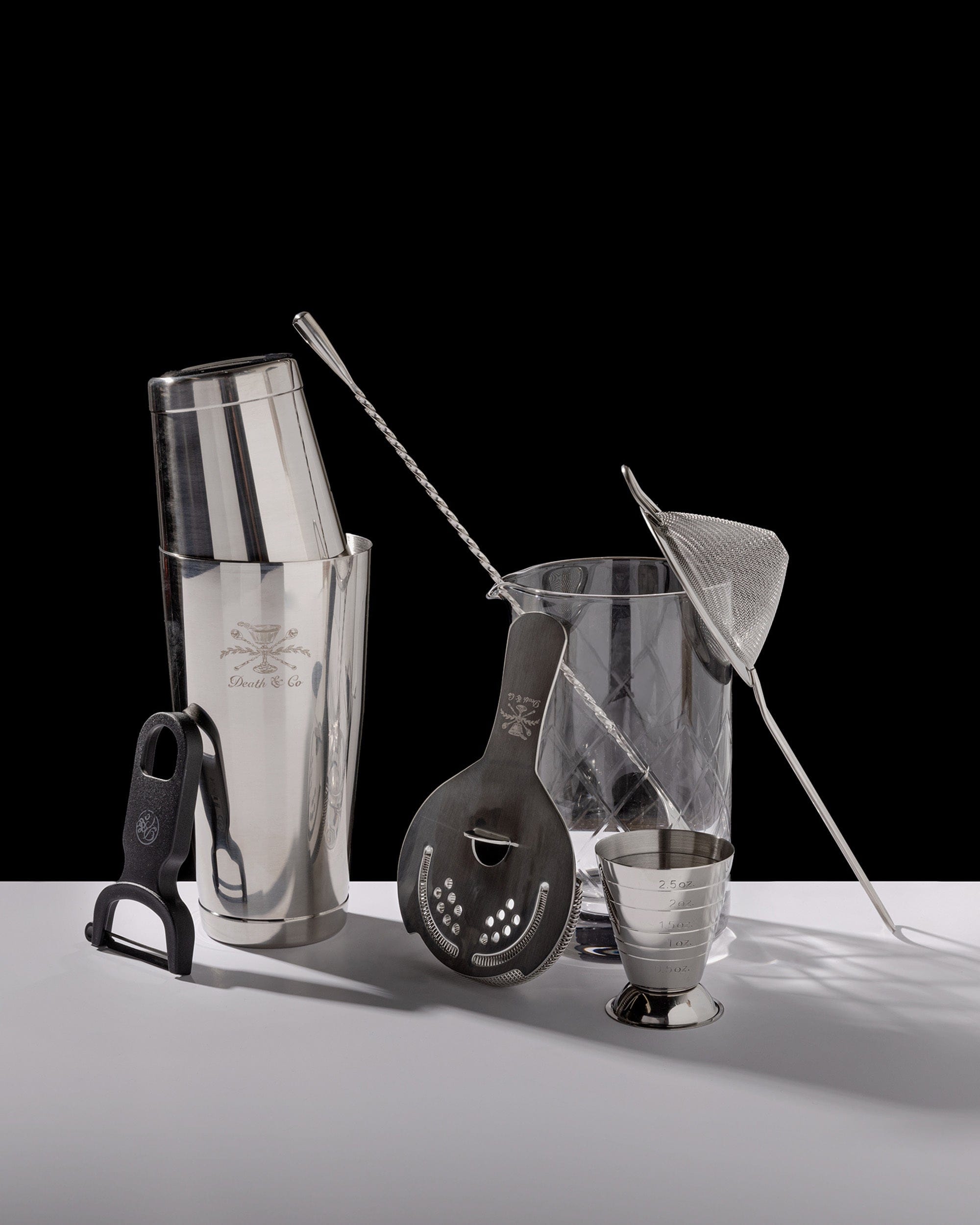 Included is a set of weighted shaking tins, barspoon, stepped jigger, Hawthorne strainer, and fine mesh strainer—all finished in classic stainless steel—as well as an etched mixing glass and vegetable peeler.